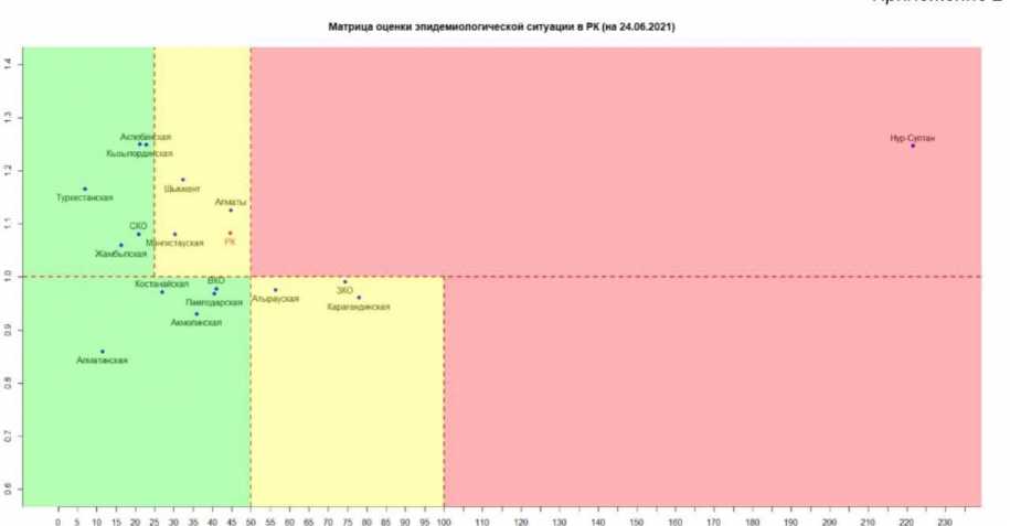 - В «зелёной» зоне: Акмолинская, Алматинская, Актюбинская, Восточно-Казахстанская, Жамбылская, Костанайская, Кызылординская, Туркестанская, Павлодарская области и СКО.