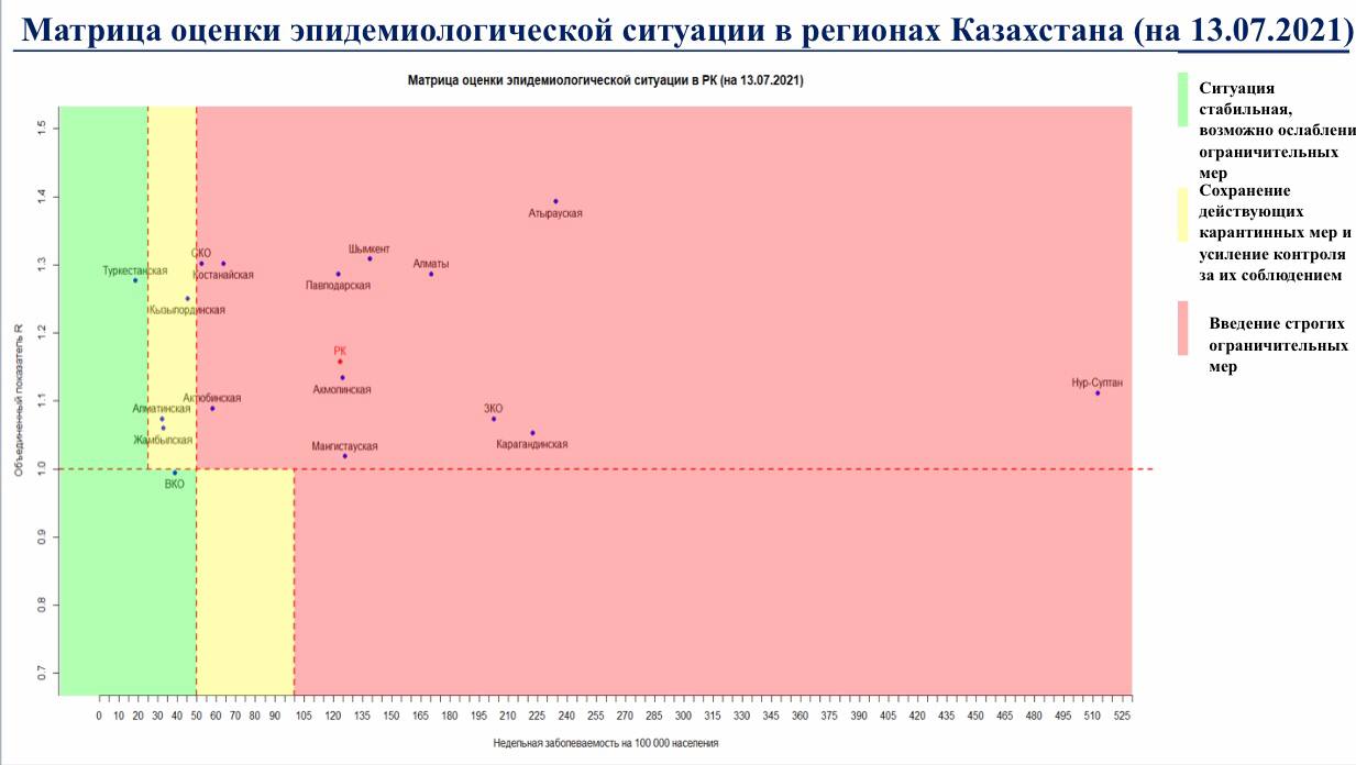 В «красной» зоне: гг. Нур-Султан, Алматы, Шымкент, Акмолинская, Актюбинская, Атырауская, Западно-Казахстанская, Карагандинская, Костанайская, Мангистауская, Павлодарская и Северо-Казахстанская области.