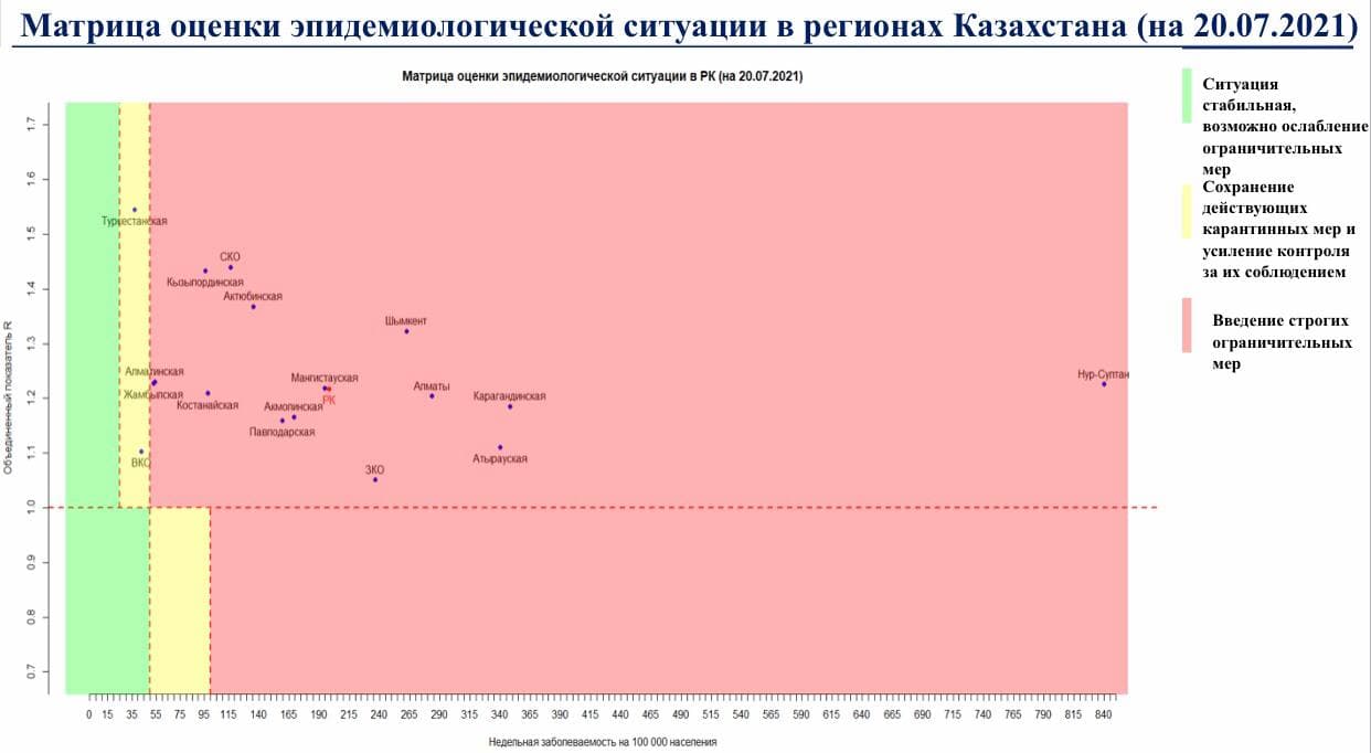 В «красной» зоне: гг. Нур-Султан, Алматы, Шымкент, Алматинская, Акмолинская, Актюбинская, Атырауская, Жамбылская, Западно-Казахстанская, Карагандинская, Костанайская, Кызылординская, Мангистауская, Павлодарская и Северо-Казахстанская области.
