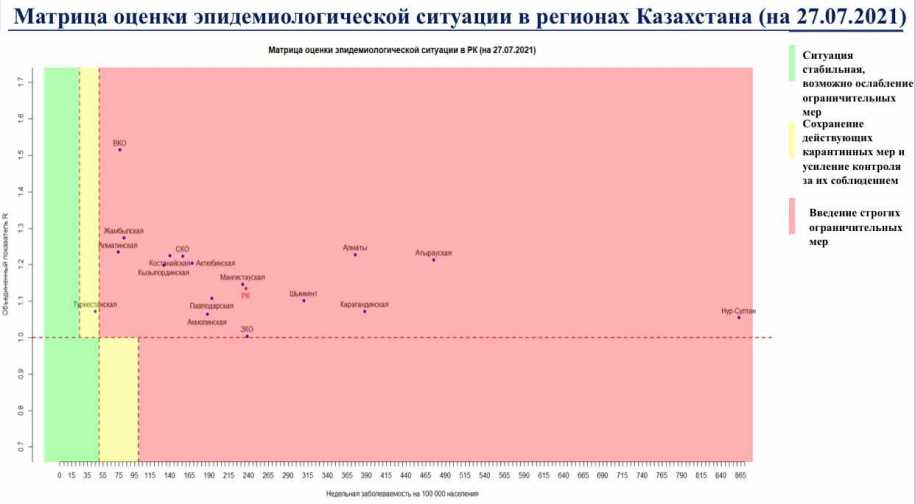 В «красной» зоне: гг. Нур-Султан, Алматы, Шымкент, Акмолинская, Актюбинская, Алматинская, Атырауская, Восточно-Казахстанская, Жамбылская, Западно-Казахстанская, Карагандинская, Костанайская, Кызылординская, Мангистауская, Павлодарская и Северо-Казахстанская области.