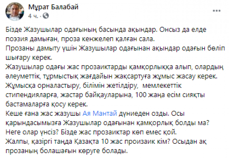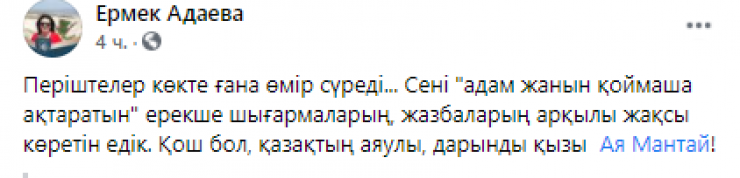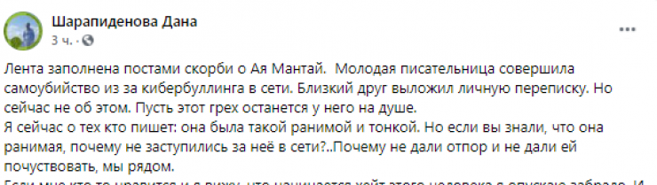 29 июля умерла молодая казахстанская писательница Аягуль Мантай. Информацию о смерти девушки подтвердили в Департаменте полиции Туркестанской области, заведено дело по статье "Доведение до самоубийства", сообщает kazlenta.kz со ссылкой на tengrinews.kz.
