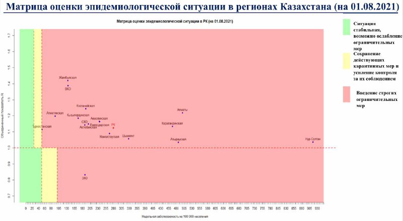 В «красной» зоне: гг. Нур-Султан, Алматы, Шымкент, Акмолинская, Актюбинская, Алматинская, Атырауская, Восточно-Казахстанская, Жамбылская, Западно-Казахстанская, Карагандинская, Костанайская, Кызылординская, Мангистауская, Павлодарская, Северо-Казахстанская и Туркестанская области.