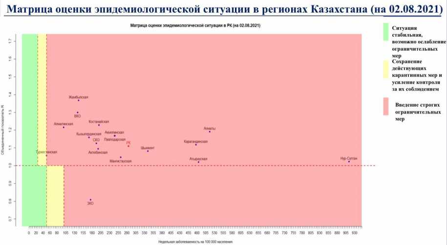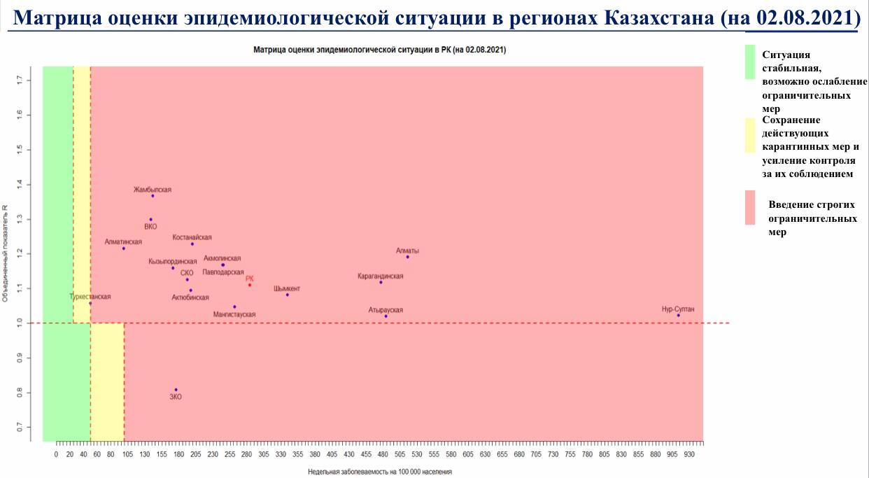 Матрица оценки эпидемиологической ситуации в регионах Казахстана на 02 августа 2021 года, сообщает kazlenta.kz со ссылкой на МВК.
