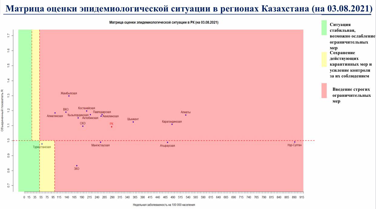 В «красной» зоне: гг. Нур-Султан, Алматы, Шымкент, Акмолинская, Актюбинская, Алматинская, Атырауская, Восточно-Казахстанская, Жамбылская, Западно-Казахстанская, Карагандинская, Костанайская, Кызылординская, Мангистауская, Павлодарская и Северо-Казахстанская области.