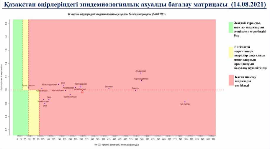 В «красной» зоне: гг. Нур-Султан, Алматы, Шымкент, Акмолинская, Актюбинская, Алматинская, Атырауская, Восточно-Казахстанская, Жамбылская, Западно-Казахстанская, Карагандинская, Костанайская, Кызылординская, Мангистауская, Павлодарская и Северо-Казахстанская области.