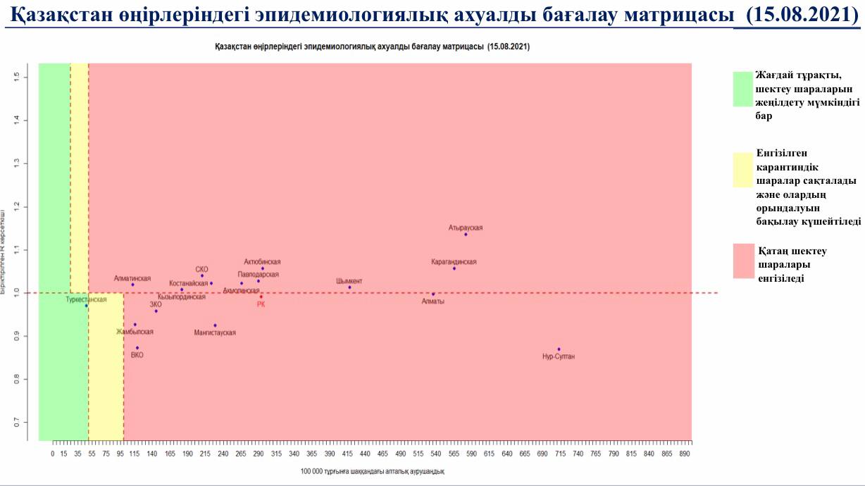 В «красной» зоне: гг. Нур-Султан, Алматы, Шымкент, Акмолинская, Актюбинская, Алматинская, Атырауская, Восточно-Казахстанская, Жамбылская, Западно-Казахстанская, Карагандинская, Костанайская, Кызылординская, Мангистауская, Павлодарская и Северо-Казахстанская области.
