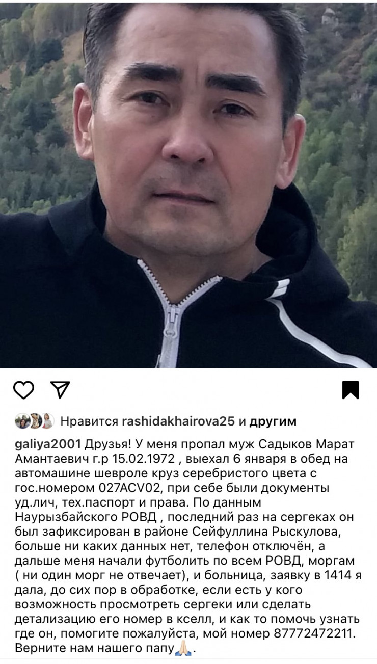 Марат выехал из дома на автомашине 6 января в Алматы. До сих пор от него нет никаких вестей. Его машину нашли, но поиски самого мужчины пока безуспешны.