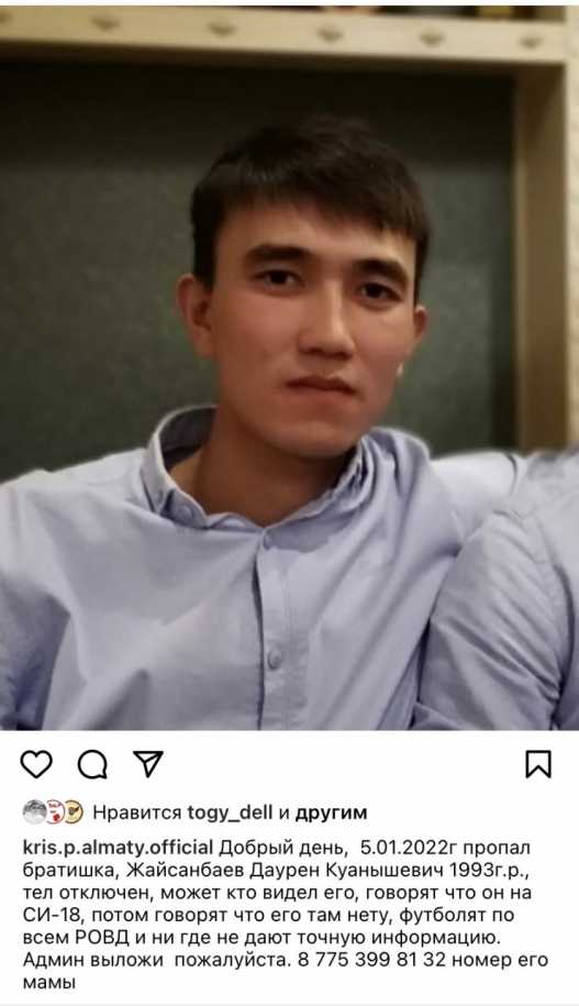 Вышел из дома 5 января и до сих пор не вернулся. По словам его матери, он работал установщиком антенн. Жил в Алматы на улице Бокейханова (Аэродромная)-Рыскулова. В тот день они якобы отправились на работу вместе с другом Бекжаном. От него тоже нет вестей. Дома Даулета ждут жена, двое детей и престарелая мать.