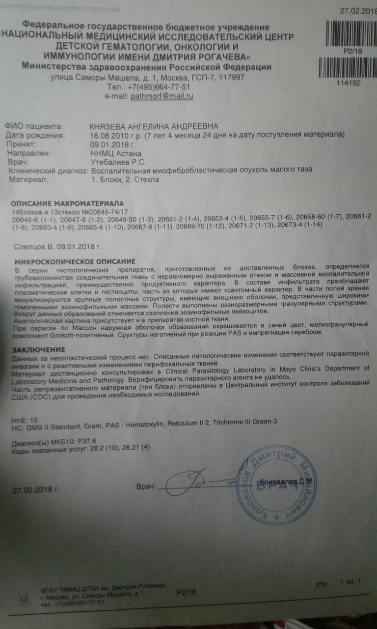 У Ангелины Князевой воспалительная миофибробластическая опухоль малого таза. Ребёнку сделали две операции и химиотерапию. Оксана Князева одна воспитывает троих детей. Ангелина самая младшая. Почти год они борются с раком.