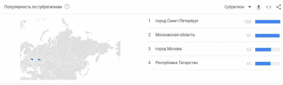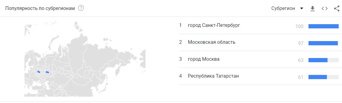 Стоит отметить, что активнее всего данным вопросом интересовались пользователи из Санкт-Петербурга, далее Московской области, Москвы и Татарстана.