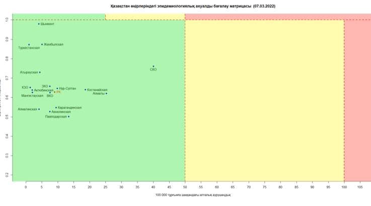В «зеленой» зоне: гг.. Нур-Султан, Алматы, Шымкент, Алматинская, Актюбинская, Атырауская, Акмолинская, Западно-Казахстанская, Восточно-Казахстанская, Жамбылская, Карагандинская, Костанайская, Кызылординская, Мангистауская, Северо-Казахстанская, Павлодарская, Туркестанская области.