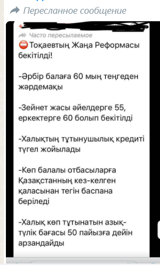 Сообщения о новой реформе рассылают казахстанцы в мессенджере WhatsApp. Она якобы гласит, что каждому ребенку положена выплата в размере 60 000 тенге, пенсионный возраст для женщин и мужчин будет снижен до 55 и 60 лет соответственно, все потребительские кредиты полностью спишут, а всем многодетным семьям выдадут квартиры во всех городах страны. Это неправда, поясняет Stopfake.kz.