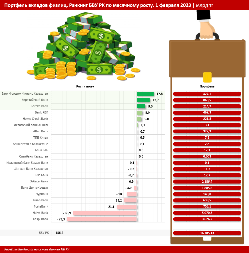 Впрочем, в январе текущего года была отмечена весьма любопытная тенденция: на фоне традиционного сокращения объёма вкладов в крупных банках в этот период некоторые БВУ РК показали позитивную динамику. Наибольший месячный рост был зафиксирован у Банка Фридом Финанс: на 17,8 млрд тг, до 327,1 млрд тг. На втором месте — Евразийский Банк: плюс 13,7 млрд тг, до 868,5 млрд тг, - пишут аналитики.
