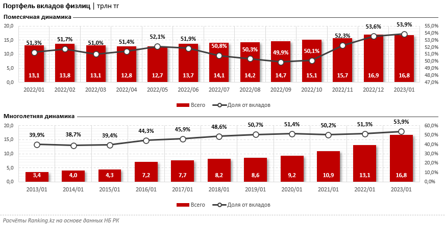 За год, то есть в сравнении с итогами января 2022-го, совокупный объём вкладов населения в казахстанских банках вырос на 3,7 трлн тг.