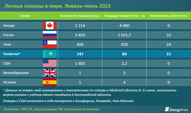 По площади лесных пожаров, произошедших с начала года, Казахстан стоит на четвёртом месте после Канады, России и Чили. В нашей стране огнём уничтожен лес на общей площади около 84 тыс. га. Не исключено, что эта цифра может увеличиться, так как она включает в себя площадь ещё не локализованного пожара в Абайской области (по предварительным данным она составляет 60 тыс. га).
