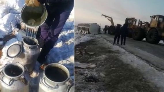 «Спиртовоз разбился, черпаем флягами из канавы. Приезжайте в гости… У нас в Казахстане спирт прямо возле дороги», — говорит один из мужчин на видео.