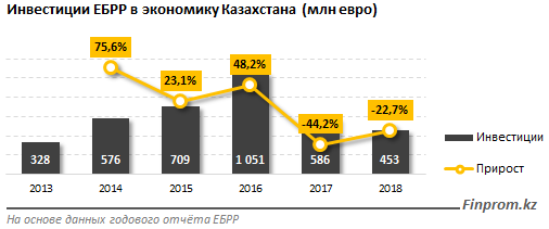 По итогам 2018 года сумма инвестиций ЕБРР в экономику Казахстана составила 453 млн евро — на 22,7% меньше, чем годом ранее. Максимальный объем инвестиций за последние годы был зафиксирован в 2016 году: 1,1 млрд евро. На сегодняшний день банк проинвестировал более 7,7 млрд евро в 253 проекта Казахстана, в том числе в 32 проекта в энергетическом секторе страны.