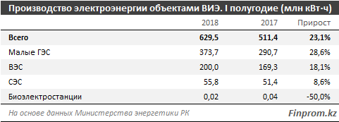 По итогам I полугодия 2018 года объем производства электроэнергии всеми объектами ВИЭ составил 629,5 млн кВт⋅ч — на 118,1 млн кВт⋅ч больше, чем в аналогичном периоде 2017 года (годовой рост +23,1%). Больше всего энергии было выработано малыми гидроэлектростанциями (ГЭС): 373,7 млн кВт⋅ч — сразу на 28,6% больше, чем годом ранее. Объем производства ВЭС достиг 200 млн кВт⋅ч (годовой рост +18,1%). Замыкают тройку лидеров объекты СЭС: 55,8 млн кВт⋅ч — на 8,6% больше, чем в аналогичном периоде 2017 года.