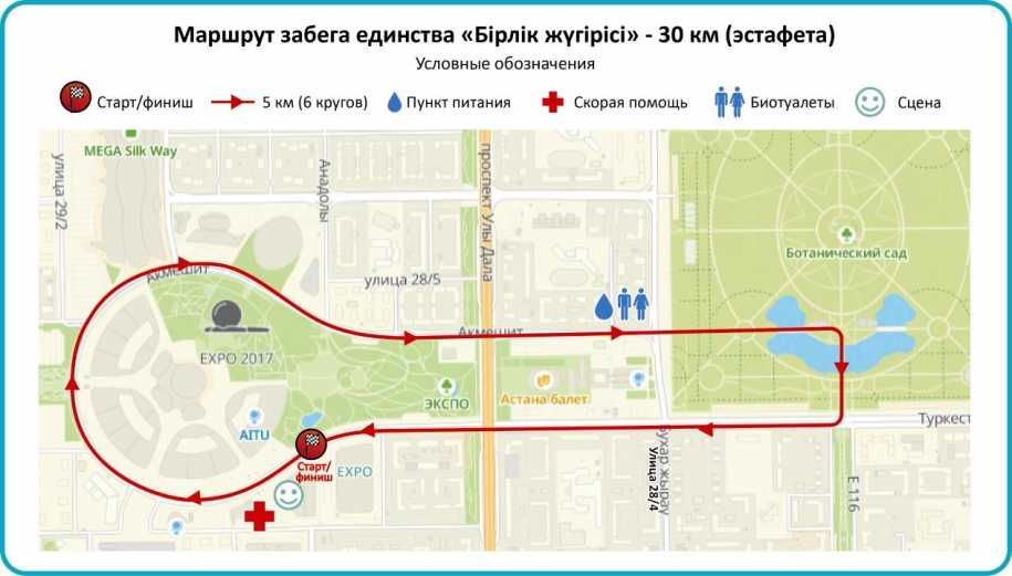 Старт забега состоится в районе МВЦ EXPO. На время проведения мероприятия будут закрывать движение на участках улиц Туркестан и Акмешит по следующему графику: